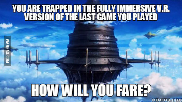 sharkroyalty Uncategorized April 12, 2016December 8, 2018 1 Minute ragecomics4you: The only way to log out is to beat the game. And if you die in the game you die for real. Share this: Share on X (Opens in new window) X Share on Facebook (Opens in new window) Facebook Like Loading... Related Published by sharkroyalty View all posts by sharkroyalty Published April 12, 2016December 8, 2018