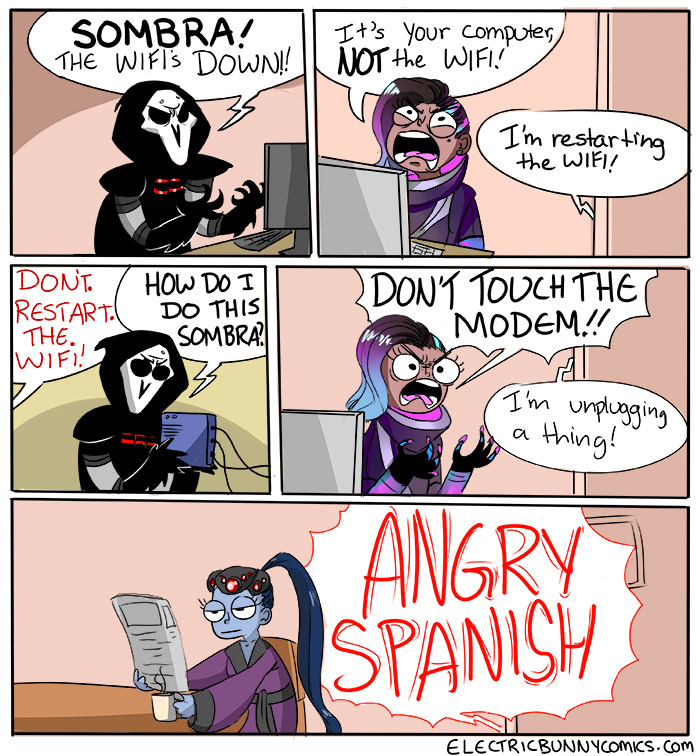 http://www.electricbunnycomics.com/View/Comic/177/Tech+Support+SombraI just had to make this as soon as I hear about the release of Sombra for Overwatch today.