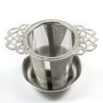 - A fancy as hell tea strainer, a fancy as hell tea tin, and a big teacup (they’ve got a really pretty matte finish, they’re 8oz I’m pretty sure, and they come in three colors, yellow, gray, and pale turquoise)