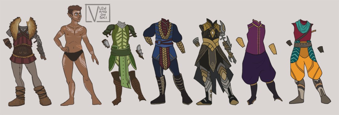 I had to make a paper doll for class and so, of course, I went with Dragon Age junk because I am predictable. Made six outfits for Zev Lavellan roughly based on Ferelden, the Dalish, Orlais, Tevinter, Rivain, and Antiva. Kept them simple but man oh man would I love to go wild with details one day.Â