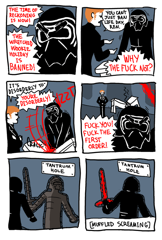 i think that the truth behind kylo’s path to the dark side is being forced to attend Life Day festivities with chewy and his parents. if you havent seen the star wars christmas special please,,,,,,, do